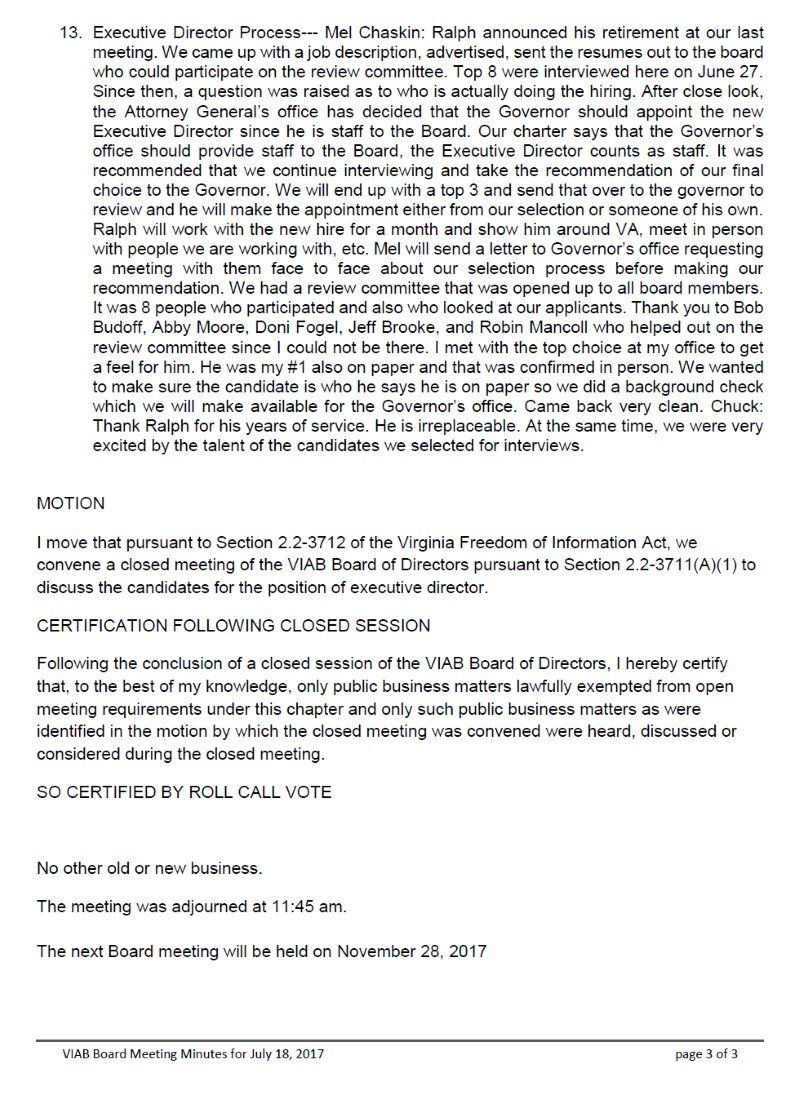 Mel Chaskin reports that "the Attorney General's office has decided that the Governor should appoint the new Executive Director." (See item 13 on page 3 of the 07/18/2017 VIAB meeting minutes incuded below.)